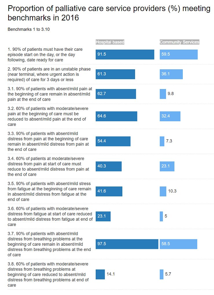 What statistical information we have about the extent to which palliative care services meet patient and carer needs comes from voluntary reporting based on meeting certain benchmarks. These include targets such as having 60 per cent of patients with moderate to severe pain at the beginning of the care period, reduced to absent or mild pain at the end of the period.