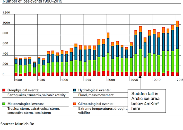 The rise in meteorological and hydrological events is recorded by the Munich-Re institute, as in the figure below: