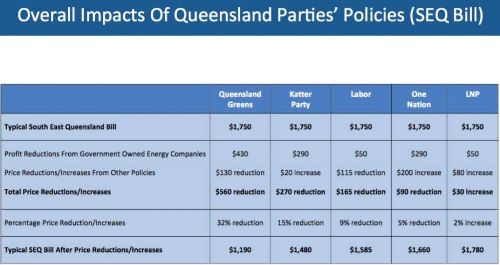 The analysis by Queensland-based energy expert Hugh Grant concludes that there would be a wide range of price impacts arising from the various policies, ranging from a price reduction of around $600 a year from the Queensland Greens’ policies, to a price increase of around $30 from the LNP’s policies.