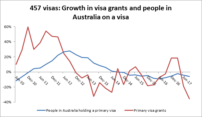 As economic conditions did not sharply deteriorate in the July to September 2017 quarter, it seems unlikely employers stopped using the 457 visa program due to a big reduction in demand for workers. This suggests the change in government policy was an important factor in shaping the visa grant trend. However, there has been little public commentary or analysis of these changes or recent data (an August 2017 report by Bob Birrell from the Australian Population Research Institute is the major exception).