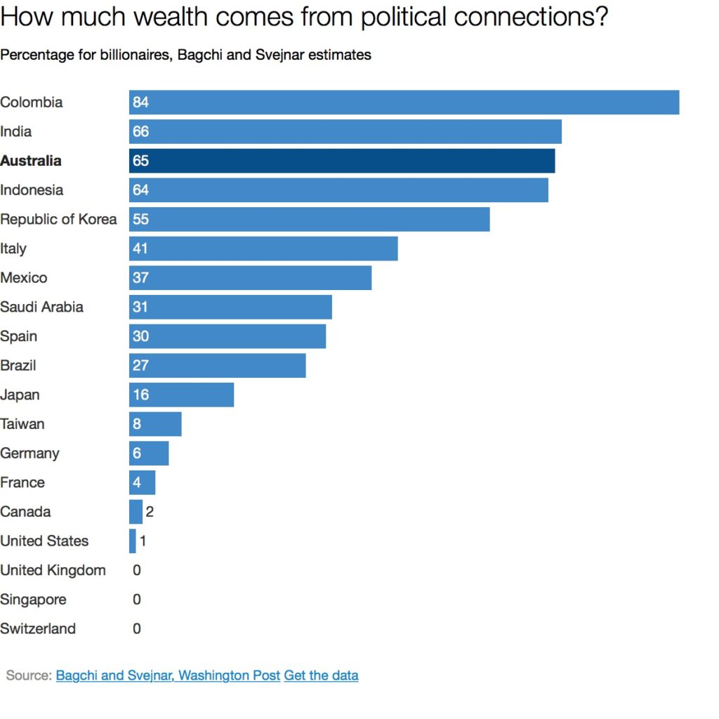 In Colombia 85 per cent of the billionaires were politically connected, in India 66 per cent, in Australia 65 per cent and in Indonesia 64 per cent.