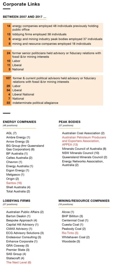 The industries in question either hire former ministerial staffers and policy analysts with relevant knowledge and expertise to advise them, or they encourage their own former staffers to take on positions as government advisers while maintaining close links with them. When acting as staffers, these individuals are free to operate outside of public scrutiny and regulatory reach. This allows them to move seamlessly between the offices of powerful political figures and some of Australia’s largest resource companies and industry bodies.