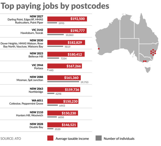 As for the wealthiest postcodes, six out of 10 were in Sydney, with the inner eastern postcode of 2027 – running from Darling Point to Point Piper. The average income in that postcode was $192,500