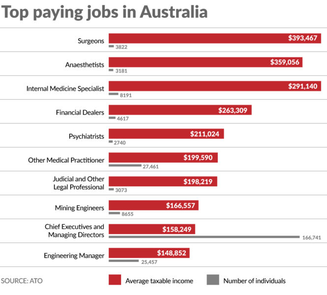 Figures released by the Australian Tax Office on Friday revealed that, with an annual income of $393,467, surgeons are the highest paid professionals in Australia.