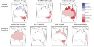These historical droughts varied widely in the area they covered, highlighting at a continental scale the spatial diversity of drought. This spatial variability has also recently been demonstrated for eastern Australia.