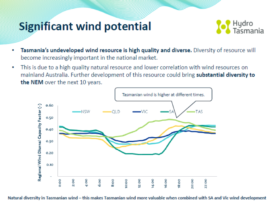 As the Hydro Tasmania engineers tell it, Tassy wind is different, tending to blow more when Big Island wind is blowing less, especially in Victoria and South Australia. That means it would add some welcome diversification.