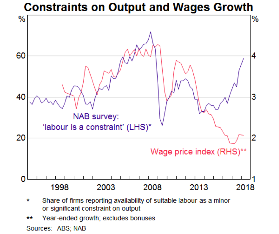 Nearly 60 per cent of businesses surveyed by NAB are reporting the supply of labour is constraining their output, a level only exceeded for the couple of boom years immediately prior to the GFC. Yet the wage price index is showing growth of 2.1 per cent.