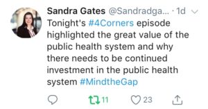 A single tweet put Monday night’s Four Corners episode into perspective for me. I’d been trying to put my finger on what seemed out of kilter with the whole segment and there it was: the program had virtually ignored the bedrock of Australian health care, the public hospital system.