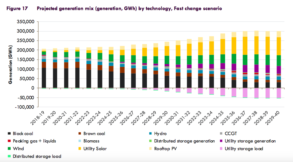 This graph above shows the “fast change scenario, and shows that the combination of black and brown coal and gas generators account for less than 100,000GWh out of total grid demand of around 250,000GWh.