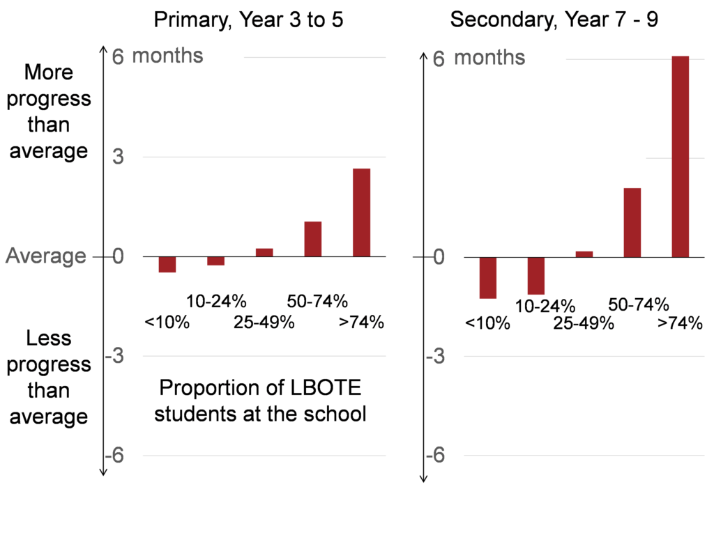 Our findings are striking. Schools with lots of students with a language background other than English make much more rapid learning growth on average, especially in numeracy.