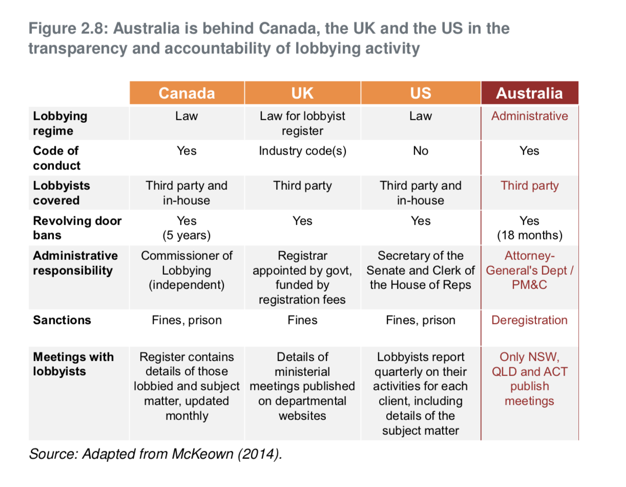 On almost any measure Australia lags behind other comparable countries in managing the lobbying scourge