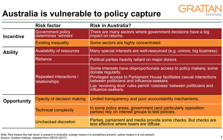 Australia’s political institutions are generally robust, but many of the “risk factors” for policy capture by special interests are present in our system. Political parties are heavily reliant on major donors, money can buy access, relationships and political connections, and there’s a lack of transparency in dealings between policymakers and special interests.