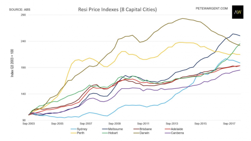 The reality of the current housing market is that prices are cooling in Sydney and Melbourne and have come off big time in the most overheated markets. No, Sydney and Melbourne weren’t the most overheated – as the accompanying graph from property analyst Pete Wargent shows, in percentage terms it was the resources boomers Perth and Darwin.