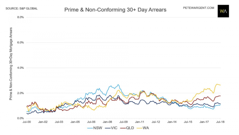 And not surprisingly, coming down from that high has meant the areas with a loans-in-arrears problem are WA and regional Queensland, as shown in another Wargent graph.
