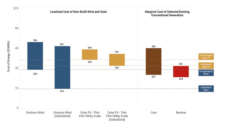 The new element is that wind and solar LCOE is now beating existing coal and nuclear plants, even those which have been fully depreciated.