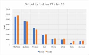 My graph this week compares the combined eastern states’ electricity fuel sources in January 2018 and 2019. We are right to be encouraged by the falling price and expansion of renewable energy sources, particularly solar, but the fact remains that coal and to a much lesser extent gas continue to dominate our sources of electrical power. Only the unreliable Victorian brown coal power stations produced significantly less output in 2019.