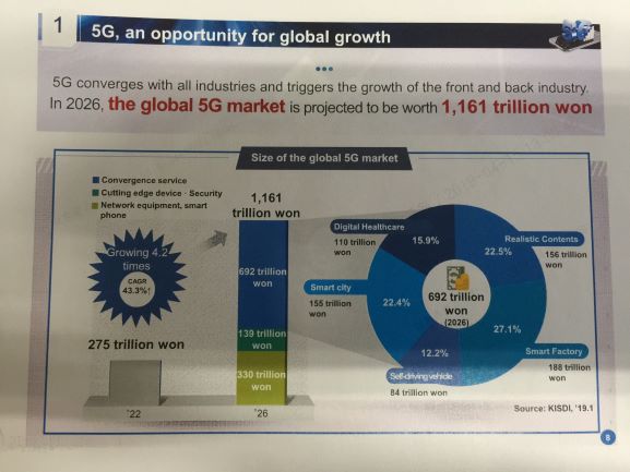 Citing Korean research, Min asserted that by 2026, 5G will be worth $1.02 trillion globally. Korea hopes, over the same period, to seize some 15% of the market, he told foreign reporters on Monday.