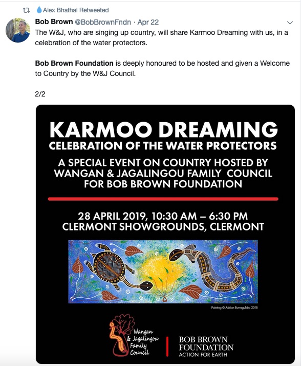 Her words are also being heard by thousands of people in Australia joining protests as Bob Brown Foundation’s Stop Adani Convoy continues its travels from Hobart to central Queensland in the face of hostile media and an advertising blitz by Adani.
