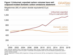 Australia’s domestic carbon emissions have been increasing slightly in recent years and are projected to continue to increase until about 2030. That said, in the longer term they have pretty stable for two or three decades. Not so the emissions from the coal and natural gas we export. Carbon emissions from those are currently about double our domestic emissions and rising rapidly.