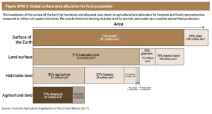 The total land and water surface of the world is approximately 510 million km2. Most is ocean and about a tenth is habitable land. Humans are using 50% of the habitable land (5% of the total surface area) for agriculture. Despite their rapid expansion in recent decades, urban areas occupy about 0.3% of the world’s total surface area (think Queensland without Cape York). This is all nicely displayed in the figure below (from page 11 of the link).