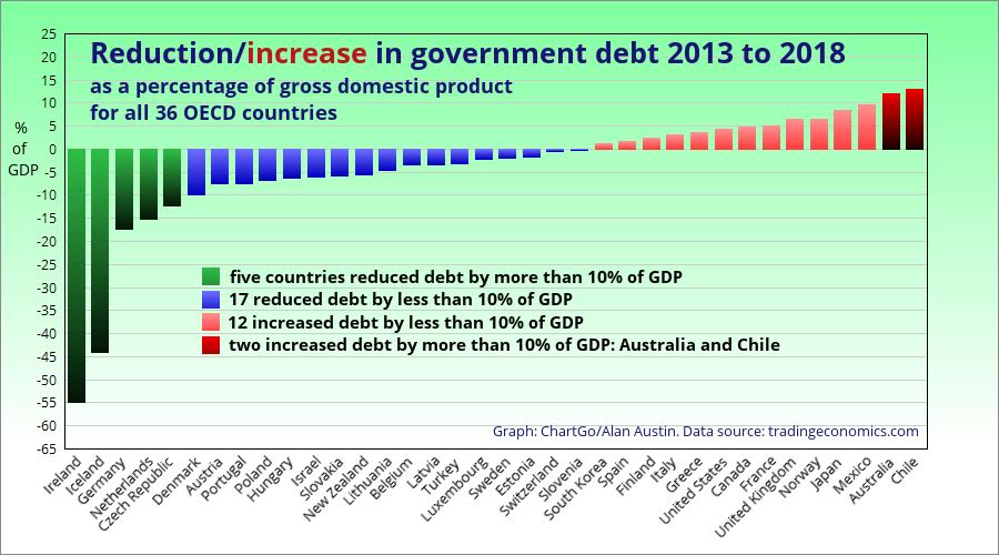 The second graph shows the debt repaid or added during the boom following the end of the GFC in 2013. Of the 36 OECD members, a solid majority of 22 reduced their debt to GDP. Another 12 increased it by less than 10% of GDP. Only two countries blew out their debt by more than 10% – Australia and Chile.