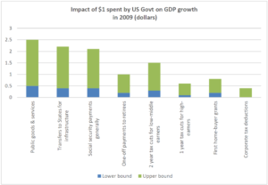 The graph below compares the impact of different government initiatives on growth in GDP in the short-term (the next few years), using ‘multipliers’: that is, the increase in a nation’s economic output generated by each dollar of additional public expenditure or tax reductions. If the multiplier is one, then all of the additional public spending flows into higher growth in GDP. If less than one, some of the extra spending is absorbed - for example into household or corporate savings or imports. If greater than one, the extra spending generates more growth through positive feedback effects, for example due to improved consumer confidence and higher employment. (See here for a more technical discussion of fiscal multipliers.)