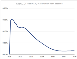 The graph below shows the projected impact of this increase in Newstart and related payments on economic growth (GDP), from modelling by Deloitte Access Economics. This peaks at an increase of 0.15% of GDP in the first year as the money is spent by households, and then tapers off over the next 8 years or so as the economy adjusts and income taxes gradually rise to pay for the Newstart increase. In the third year, the fiscal multiplier is 1.2, wages grow by 0.2% of GDP and the policy creates 12,000 additional jobs.