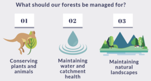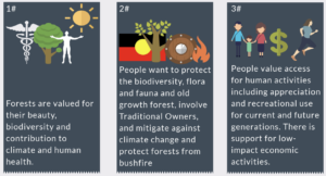 Returning to land use, the Victorian government has just released the results of the first of three phases of the Future of Our Forests community engagement process to inform a vision for the management of Victoria’s public native forests, including the modernisation of Regional Forest Agreements (RFAs). Almost 5,000 people participated in an online survey and face to face meetings, including a Youth Forest Symposium. The (encouraging) top three common themes and top three goals of forest management are shown below. While most people believed that timber harvesting of native forests should be stopped, regional respondents had a higher concern for jobs and economic opportunities than city slickers. Let’s hope the government acts on what the majority of Victorians are telling them.