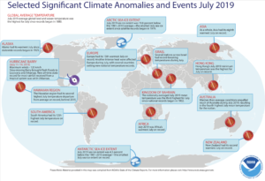 Worldwide, July 2019 was the hottest July and the hottest month ever on record. The map below displays lots of climate anomalies for the month ( larger version here). If you’d like more information you have the choice between a data-laden but readable summary or the full Global Climate Report for July 2019 from the National Oceanic and Atmospheric Administration. Note that the temperatures are all in Fahrenheit (if you’ve forgotten your school physics 1oC = 1.8oF).