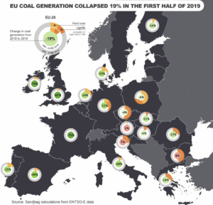 Pollies and others keep beating the coal drum here in Australia but other countries can see the writing on the (long)wall – is there anything better than a good mixed metaphor or a second rate pun? Coal generated electricity fell by 19% across the European Union in the first six months of 2019 – falls of 65% or more were recorded in the UK, Ireland and France. Renewable and gas generated electricity grew.