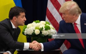 US President Donald Trump and Ukrainian President Volodymyr Zelensky shake hands during a meeting in New York on 25 September 2019, on the sidelines of the United Nations General Assembly. Photo by SAUL LOEB/AFP via Getty Images