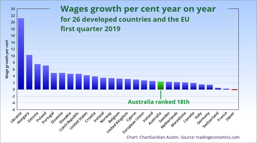 Six years later, after the global recovery has clearly boosted wage rises worldwide, Australia’s ranking has tumbled to 18th: