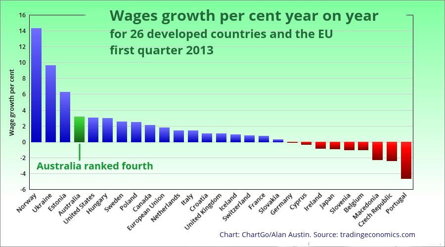 Staying with wage rises, the green chart just below shows Australia ranked fourth in the developed world in 2013, after six years of Labor: