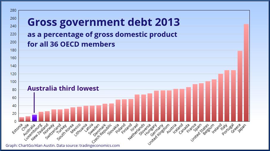 Australia’s gross government debt in 2013, after six years of Labor was just $257.4 billion, or 16.8% of GDP. That was the third lowest in the OECD, with only Chile and tiny Estonia lower.