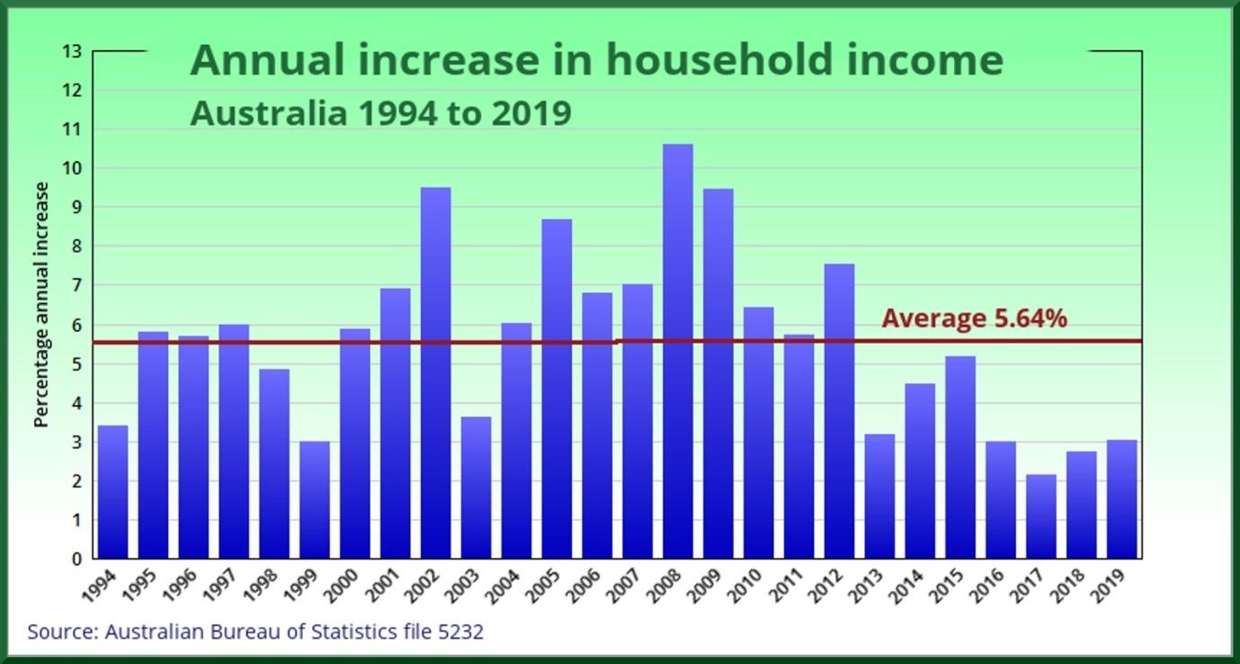 The Australian Bureau of Statistics (ABS) records the rate of increase in the household incomes. Naturally, the higher the better. The green chart, below, shows a healthy rate of increase from 1995 through until 2012, the period of the Howard and then Rudd/Gillard governments. Then it collapsed in 2013, and is yet to recover.