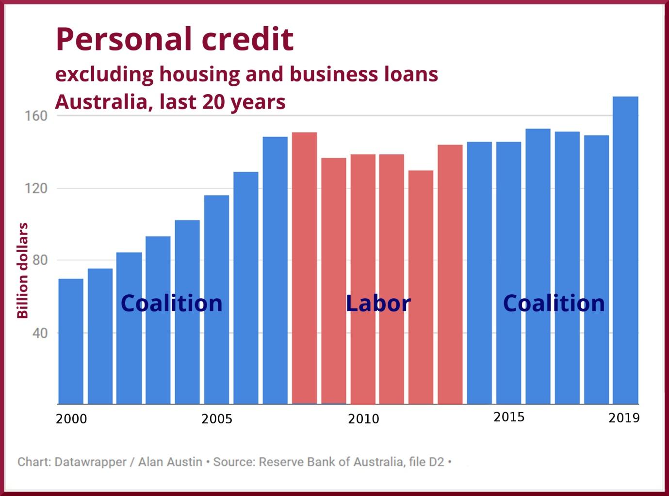 The Reserve Bank records the debts households carry. Those due to credit cards, payday loans and similar have risen during recent Coalition periods and declined under Labor: