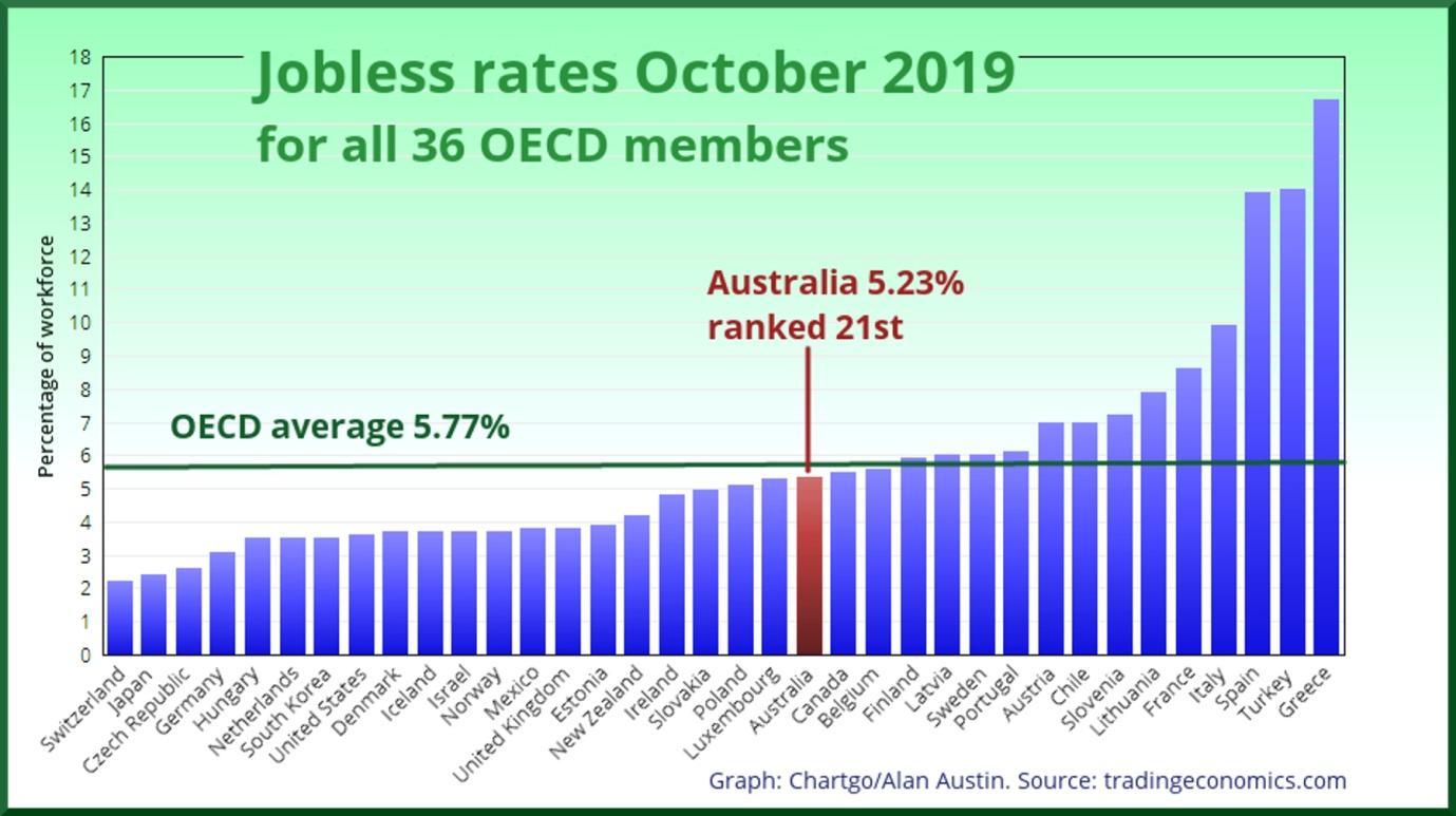 By the end of 2014, after the first failed Coalition budget, Australia’s jobless rate had risen to 6.10% and OECD ranking had slipped back to 11th. By December 2015, with the global recovery well underway, the ranking had tumbled to 13th. At the end of 2018, ranking was down to 18th.