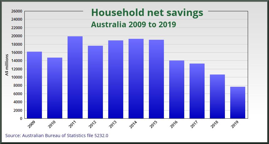 Net savings across the community are also measured by the ABS. These remained pretty constant from 2009 to 2015, even through the global financial crisis (GFC), but have slipped each year since.