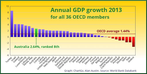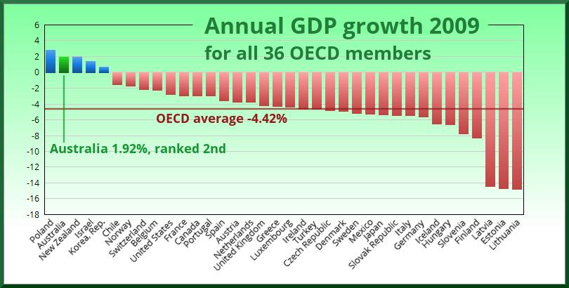 Then came the devastating 2008 global financial crisis to which Australia responded with a vast stimulus program implemented with blinding speed. In 2008, just one year after Labor took charge, annual GDP growth registered 3.66%, which was the OECD’s third highest, just behind Poland Slovakia. The following year, 2009, Australia climbed past the Slovaks to second rank.