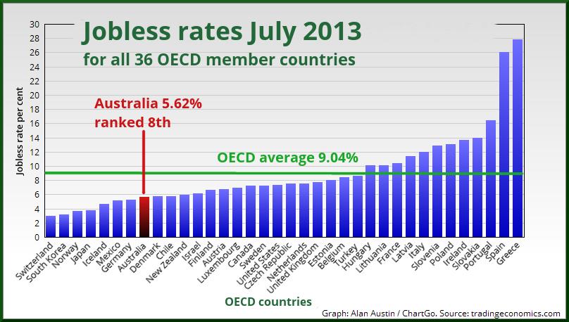 By 2000, Australia had lifted to 17th, then in 2004 to 13th. By the end of the Howard Government, the jobless rate had tumbled to 4.33%, which ranked a creditable 12th out of the 36 OECD economies.