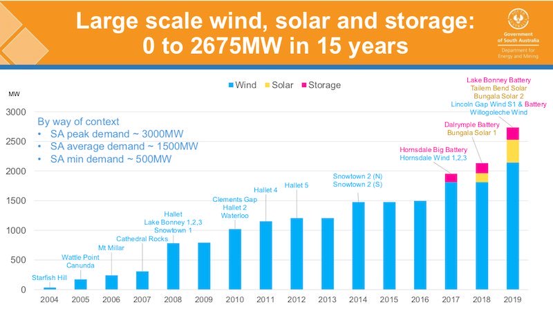 In that 15 year period, the state has shifted from zero large-scale wind, solar and storage, to 2,675MW (and there is a lot more coming, see below). The first wind installation was at Starfish Hill in 2004, the latest is the Lincoln Gap wind farm and battery and the Willogeleche wind farm.