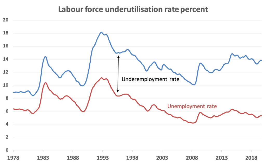 The headline figure for the state of employment is the unemployment rate. Less attention is given to the underemployment rate, as measured by the proportion of people who prefer to work longer hours if available. At the turn of the century the underemployment rate was 6.3 per cent; by October this year it has risen to 8.5 per cent. The graph below shows the total labour force underutilisation rate – the sum of unemployment plus underemployment. Underutilisation remains stubbornly high at about 14 per cent: among Australians aged 15 to 24 it is around 30 per cent.
