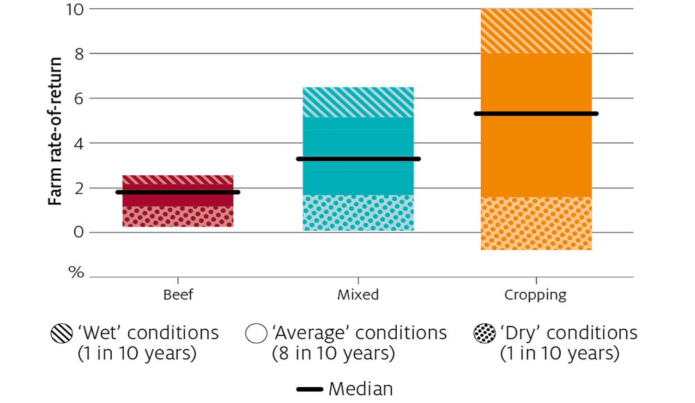 The model finds that cropping farms generally face greater climate risk than beef farms, but also generate higher average returns.