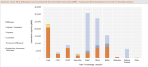 In his press release on the deal Mr Morrison asserts that ‘There is no credible energy transition plan, for an economy like Australia in particular, that does not involve the greater use of gas as an important transition fuel’. Not so fast, hand-grabber. First, there are credible transition plans that do not involve gas as a transition fuel. Second, gas is very expensive in Australia and buyers are going elsewhere. Result: generation has fallen 41% between 2014 and 2018. Third, sometimes the market gets it right and this is one of those occasions: there is no committed private sector investment in new gas powered electricity generation (or coal for that matter) in Australia’s National Electricity Market. All the committed funds are going into solar, wind, batteries and hydro (a total of 5750 MW). See the two graphs below.