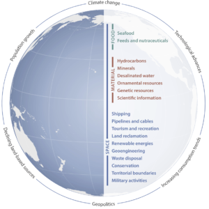 ‘Claiming marine resources and space is not new to humanity, but the extent, intensity, and diversity of today’s aspirations are unprecedented. We describe this as the blue acceleration – a race among diverse and often competing interests for ocean food, material, and space’, quoted from the abstract of The Blue Acceleration: The Trajectory of Human Expansion into the Ocean. The figure below summaries many of these claims. Finally, Figure 2 in the linked article demonstrates the dramatic changes that have occurred in marine environments over the last 50 years.