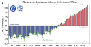 About a third of sea level rise is caused by melting polar ice and about a half comes from expansion of the oceans as they warm. And boy, are they warming! More than 90% of the heat trapped in planet Earth by greenhouse gases is absorbed in the world’s oceans, which have warmed 4.5 times faster in the period 1987-2019 than during 1955-1986. The continuous increase in heat content of the upper 2000m of ocean from 1958-2019, particularly since the mid 1980s, is clearly illustrated in the graph below. Australians are well aware of the coral bleaching caused by higher water temperatures (with another bleaching event currently occurring on the Great Barrier Reef) but many other marine species and environments (including commercial fisheries along continental coastlines) are also adversely affected by warmer seas and the ensuing more intense tropical storms and changing ocean currents.