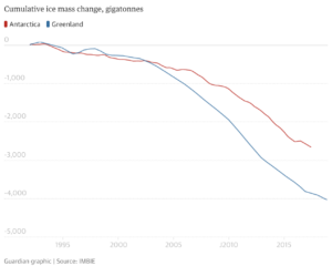 Global warming causing polar ice caps to melt is hardly news but the speed at which they are disappearing is. Recently released research indicates that Greenland and Antarctica lost ice mass during the 2010s at six-times the rate of the 1990s, with Greenland contributing 60% of the total loss since 1992. This level of loss is at the upper level of that predicted by the IPCC and will add 17cm of sea level rise to the IPCC’s mid-range prediction of 53cm by 2100. Global warming causes polar ice to melt in two ways: warmer air melts the ice from above and warmer seas melt the glaciers that flow into the oceans from below. The sea level rise resulting from the more rapidly melting ice caps will increase the number of people exposed to coastal flooding each year from 360 million to 400 million in 2100.