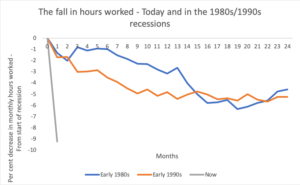 Total hours worked have decreased in just one month by 9.2 per cent. The scale and speed are difficult to comprehend. By comparison, in the major recessions of the 1980s and 1990s hours worked decreased by 6 per cent – but that was after 18 months.