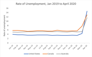 And it does make a difference. Helpfully, the ABS has provided an https://www.abs.gov.au/AUSSTATS/abs@.nsf/Latestproducts/6202.0Main%20Features20Apr%202020?opendocument&tabname=Summary&prodno=6202.0&issue=Apr%202020&num=&view= an adjusted rate of unemployment including these workers. This number looks much more what we have been seeing from the US and Canada – an unemployment rate of 11.7 per cent in Australia.