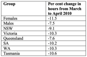 Decreases in hours worked have been much larger for females than males. And Queensland and NSW have so far fared better than other States.
